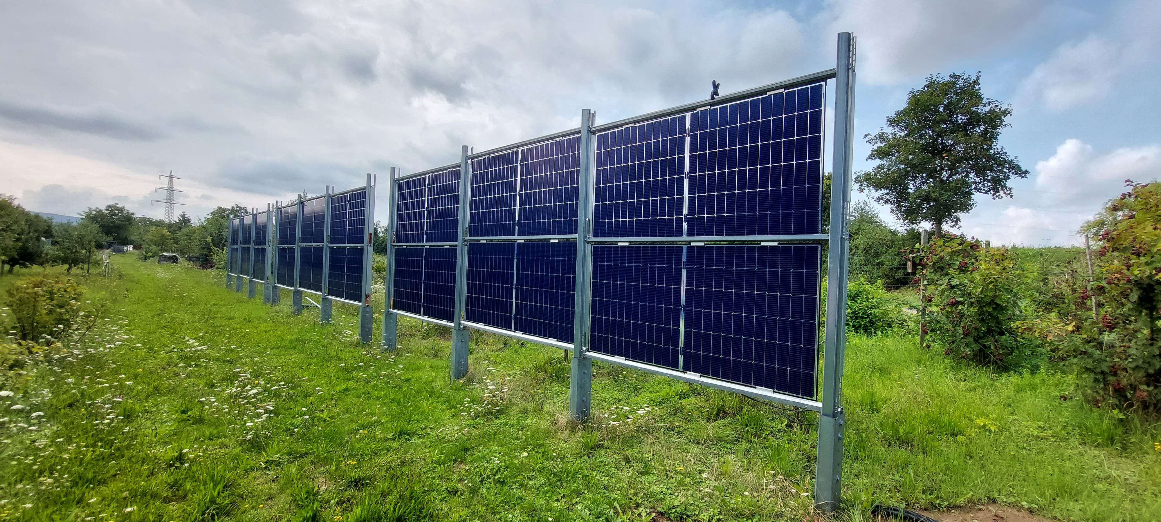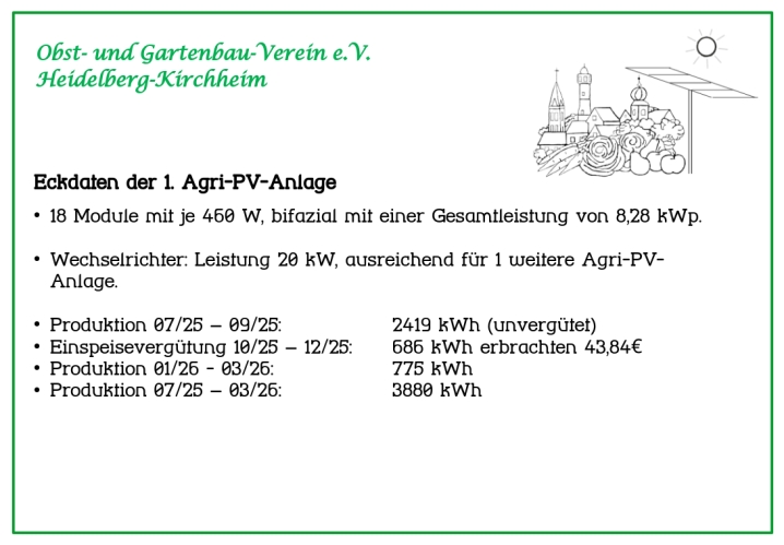 Wir haben 2025 die erste vertikale Agri-PV-Anlage in Heidelberg gebaut, die uns einerseits ermöglicht, z.B. Häcksler & Kühlschränke für Veranstaltungen zu betreiben, andererseits aber auch den nicht verbrauchten Strom dem Wohngebiet "Am Dorf" zur Verfügung zu stellen.